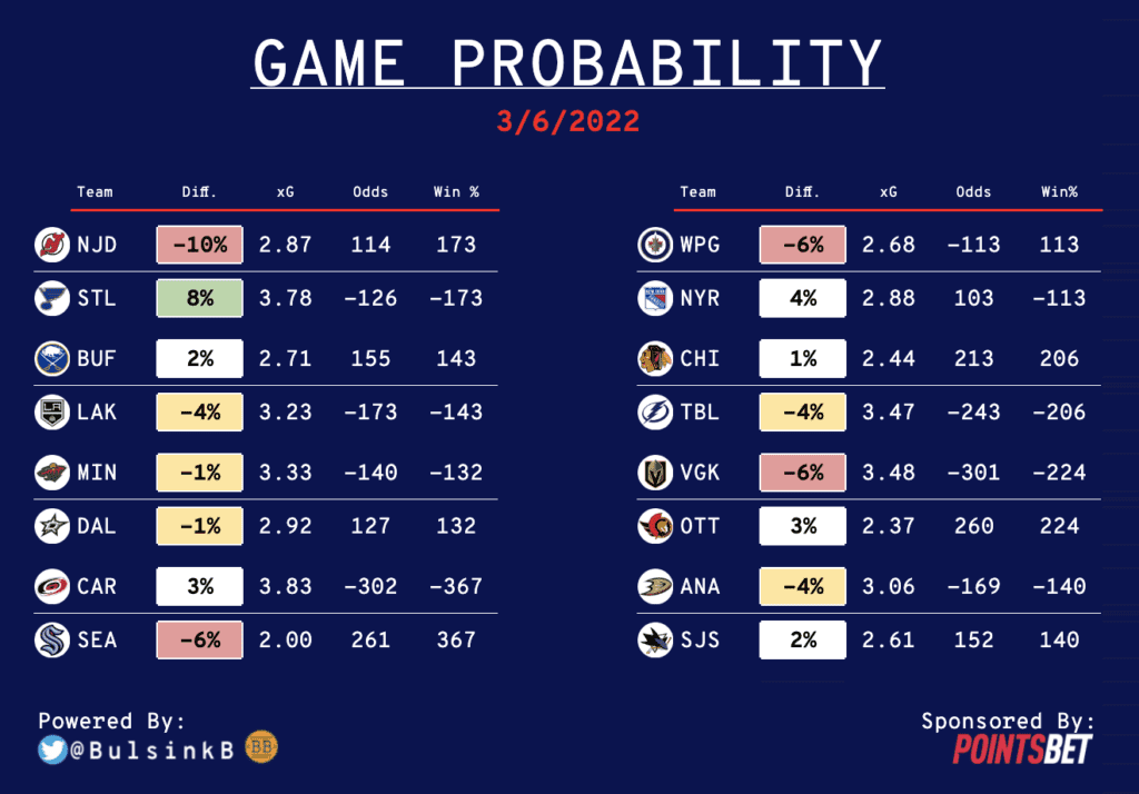 The Blues are coming off of a pretty poor performance against the Islanders on Saturday afternoon but the model likes them as -126 road favourites in New Jersey on Sunday. Ville Husso has been the better of the two netminders in St. Louis this season and he will start vs. the Devils. David Perron will also be returning to the lineup after missing yesterday’s game with an illness.