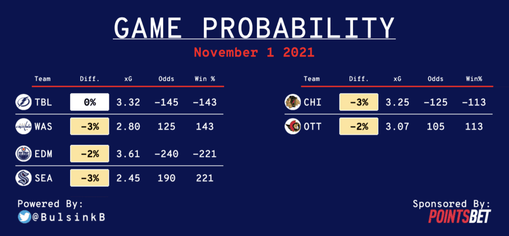 The model sincerely apologizes for a tough week and is happy to be turning the page to November. Overall, we were 5-7 last week, going -4.01 Units. We were on the wrong side of Washington’s first loss of the season to Detroit on Wednesday and then Saturday put the final nail in the coffin for the week. The Jets inexplicably lost to a Sharks team without seven of their regulars and the Penguins seemingly got worse with Sidney Crosby? Some things can’t be explained. Anyways, we are looking to get back into the green this week.