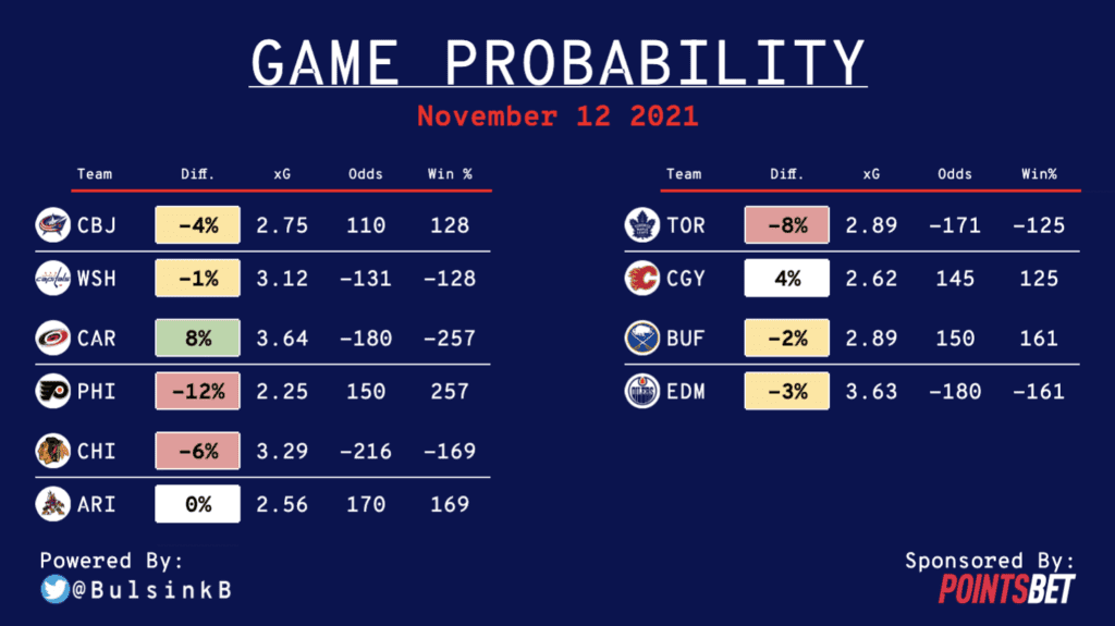 We are one month into the season and the Hurricanes have lost one game. They are one of the best teams in the NHL at 5v5 and rank in the top-10 on the PP and PK. With Frederik Andersen’s stellar play, the Hurricanes have become a complete team this year and the model loves them on Friday.