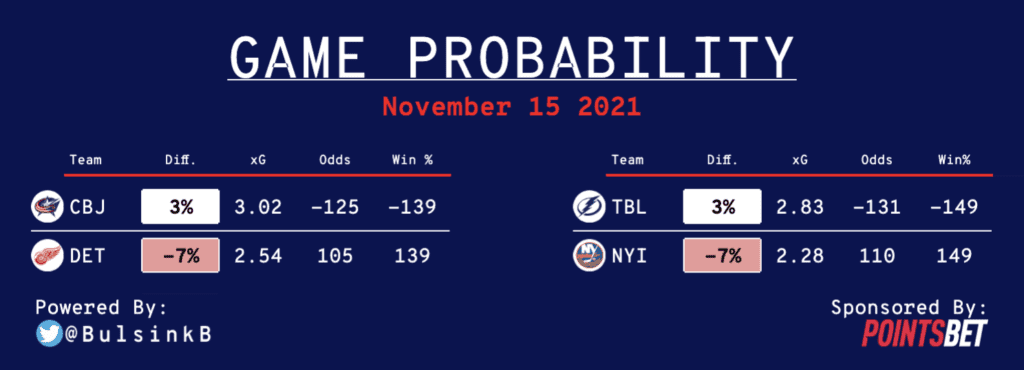 The model prefers Tampa Bay around -120, but even -131 seems generous against an Islanders team that has stumbled out of the gates. Everyone seems to think that the Isles are a defensive juggernaut, but they are 29th in ScoringChanceAgainst/60 (31.01) and 24th in High-DangerChancesAgainst/60 (11.5). If not for the remarkable play of Ilya Sorokin they would have a lot more than six losses.