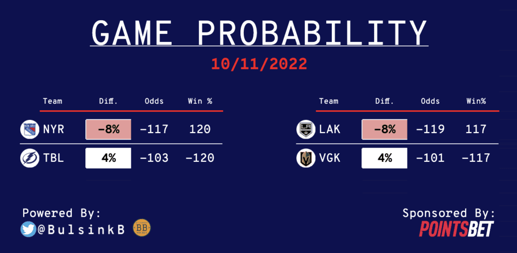 Each day we will look at each game, the Sportsbook Odds (via PointsBet), and the odds of each team winning based on the model created by Philip Bulsink. Based on those two numbers, we can quickly identify which teams we need to bet on, which teams to avoid and which lines to keep an eye on throughout the day.