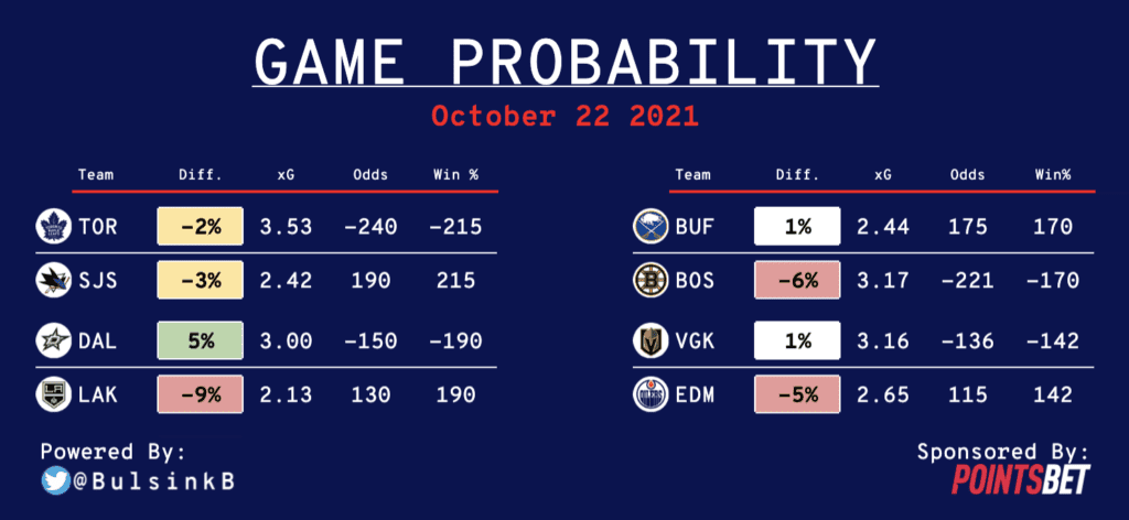 Despite the model suggesting a bet on the Stars at -150, there are a couple of factors that make it risky. First, the model is still learning about the Kings. Bringing in Phillip Danault and Viktor Arvidsson has improved this team. Second, the Stars are searching for offence right now. They have the fourth-lowest xGF (1.85) and third-least SCF/60 (21.77) through four games. Thursday’s practice lines are a clear indication that Rick Bowness doesn’t know what to do with his top players right now.