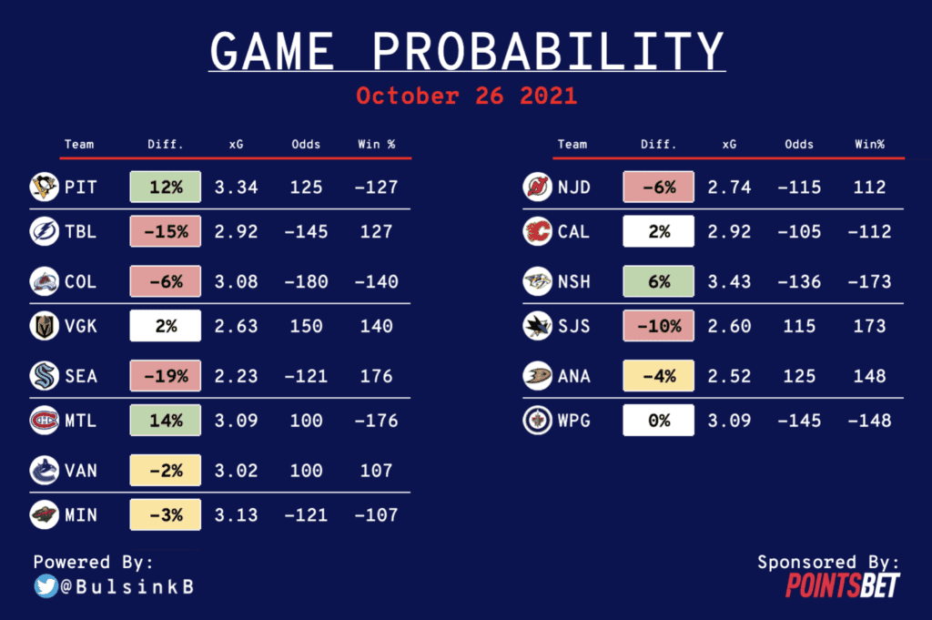 Through the first few weeks of the season, there are only a few teams who have a larger disparity between their GoalsFor and ExpectedGoalsFor than the San Jose Sharks. They’ve been riding a sky-high team shooting percentage (12.77) so it’s safe to assume that their offense will cool off in the near future. It could come as soon as tonight when they face a Predators team that is a top-10 in all of the key defensive metrics with a fresh Juuse Saros expected between the pipes. The model and I both like Nashville at -136.