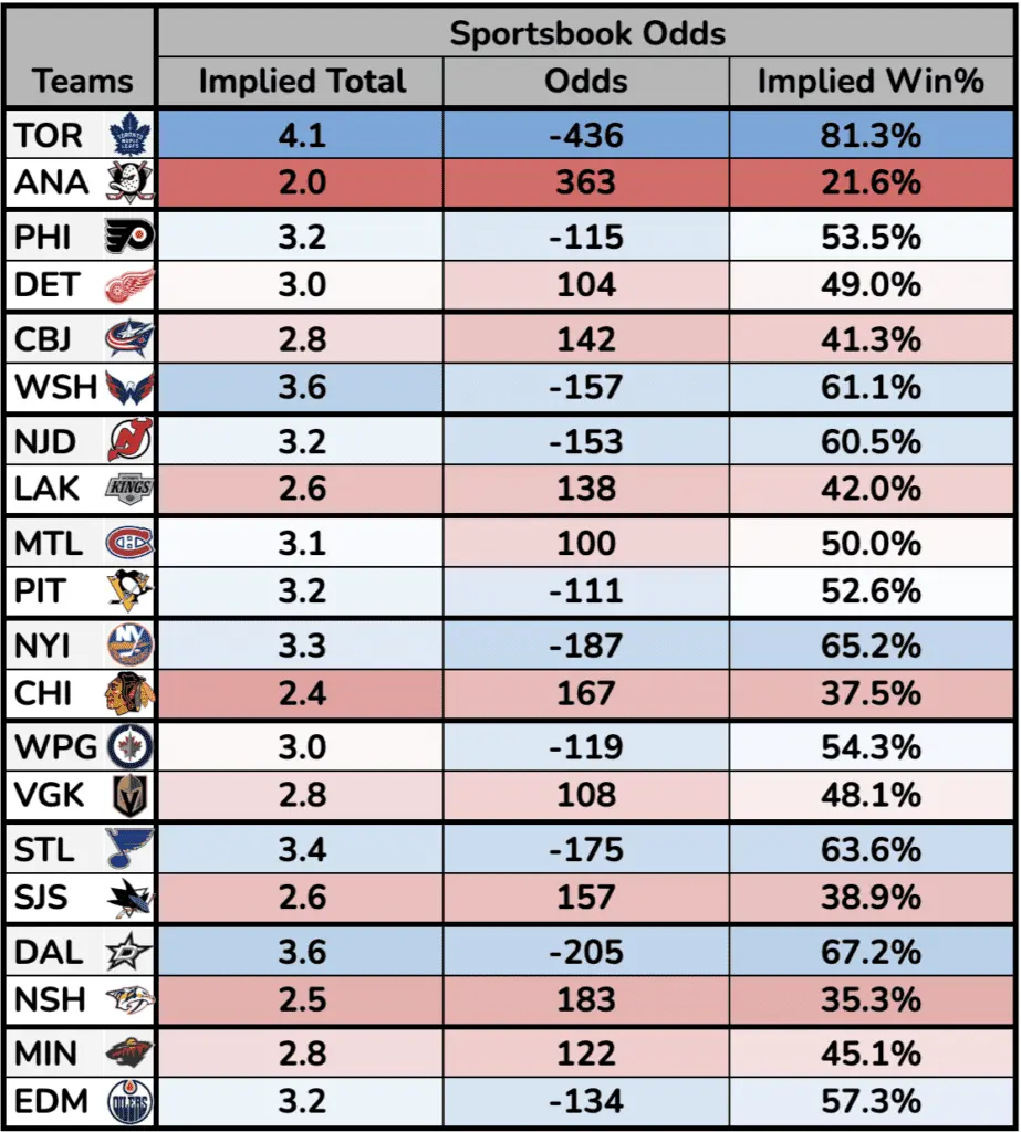 The implied totals for all of the day’s games that are included in the DFS Main Slate. Implied totals are the number of goals each team is implied to score based on Sportsbook’s game line and total. Targeting players on teams with the highest implied totals is usually a good place to start.