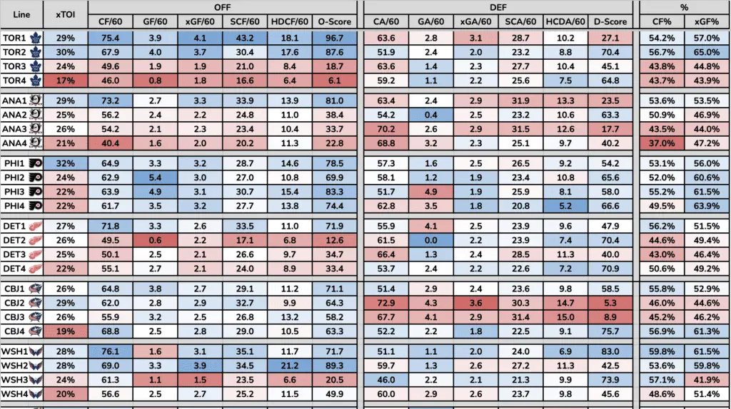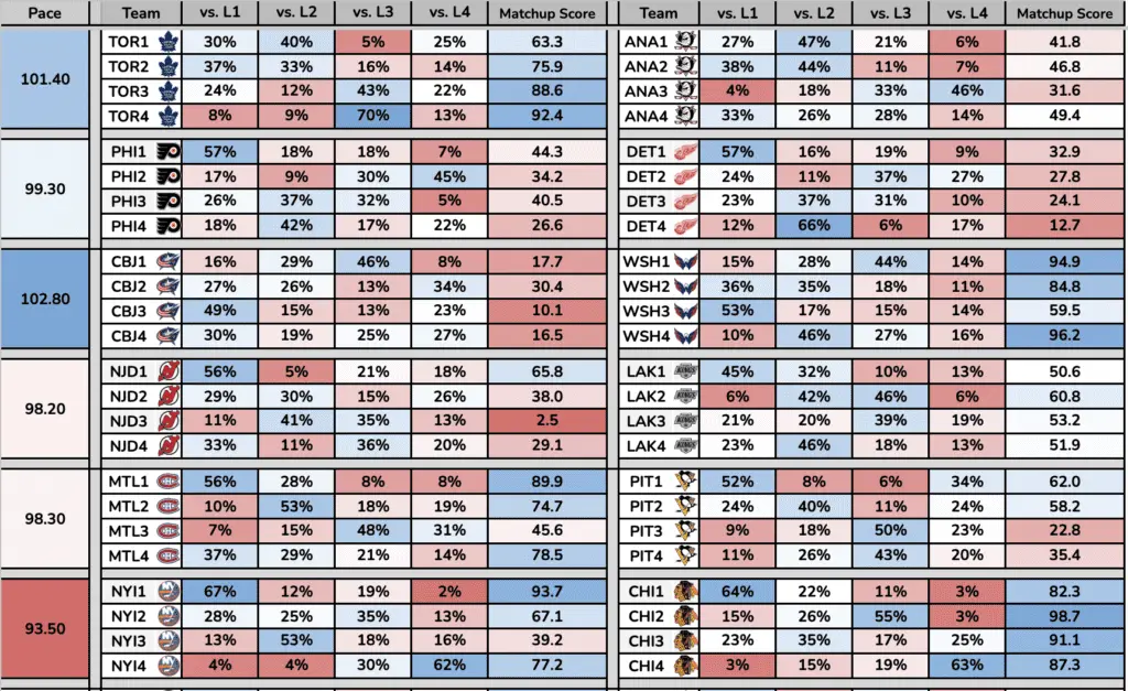 Matchups are based on historical data on how a home team deploys their lines at 5v5. The percentage is the projected percentage that each line is expected to face other lines.