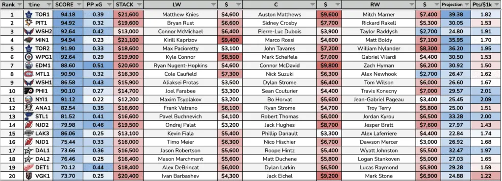 Using each line’s expected TOI, matchups and stats of both them and their opposition, we get one number: 5v5 Score. It represents which line has the best chance for high offensive output on that slate. We also include each line’s Power-play xG to give you an all-encompassing view of each line’s expected production. It also includes the prices for all three players on the line and a full line-stack price.
