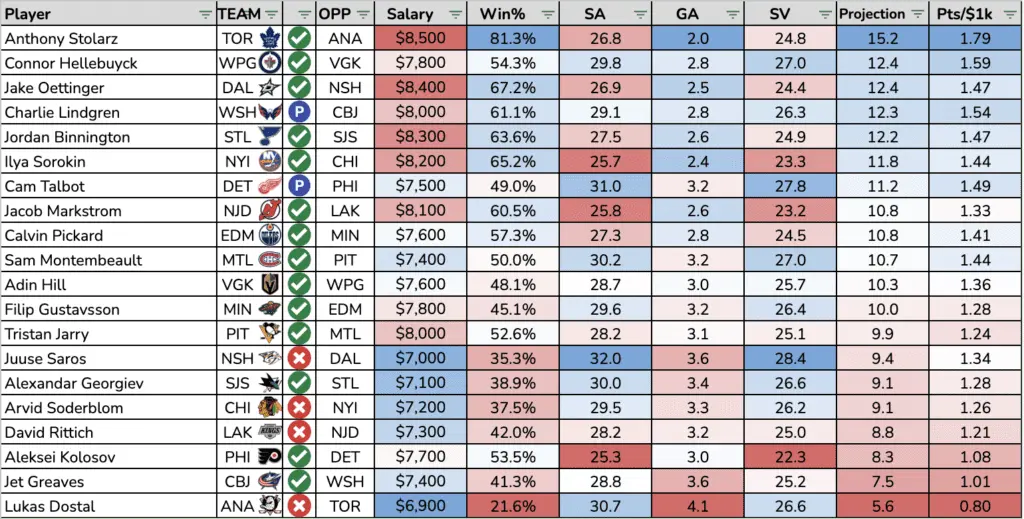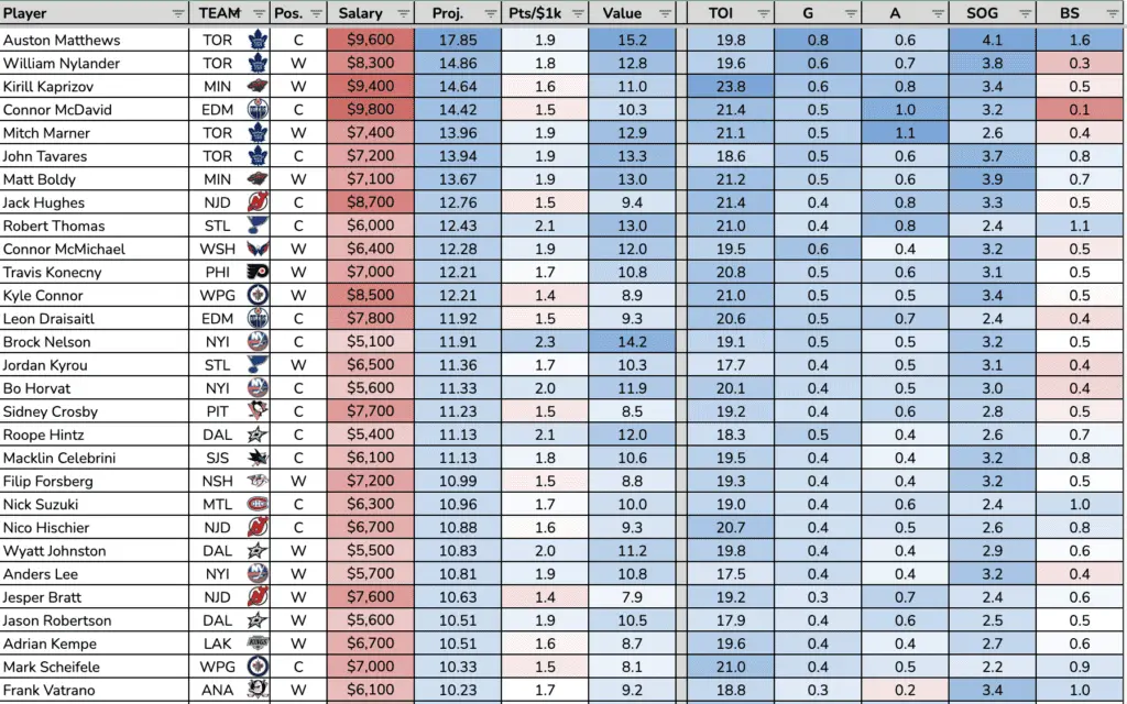 Stat-based projections for all of the Forwards and defensemen on the slate. Using the up-to-date lines on DailyFaceoff.com, we can accurately project for TOI and give us a better idea of each skater’s projected Goals, Assists, SOG and Blocked Shots.