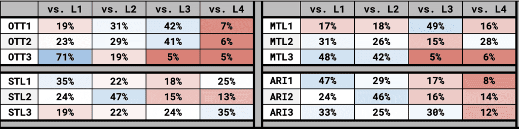 For example, we project that OTT3 (Stützle-Tierney-Brown) will play 71 percent of their 5v5 ice-time against MTL1 (Tatar-Danault-Gallagher). That will translate into 49 percent of MTL1s 5v5 TOI coming vs. OTT3. All of that TOI is simulated, using the stats below to give us an idea of how many Scoring Chances, High-Danger Chances and Expected Goals For each line will generate.