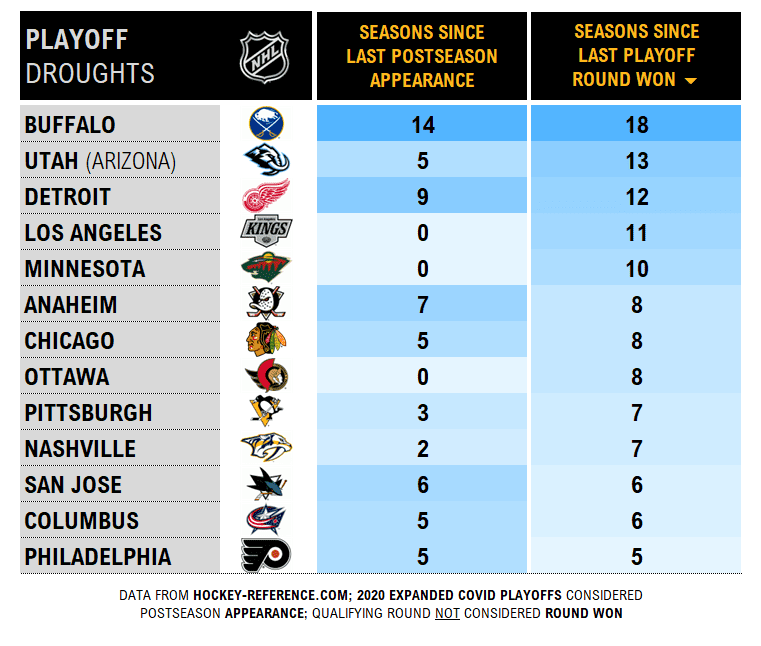 Let’s hope so. The graphic below — particularly the number of seasons some franchises have gone without winning a playoff round — should come with an NSFW warning.