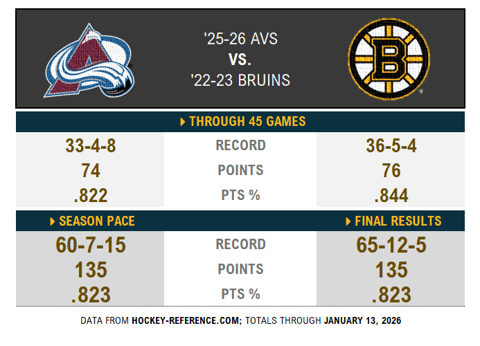 There’s no right or wrong answer. But it seems only fair to limit current teams to the current format introduced in 2005-06: no ties; shootouts; loser points. That means the ’25-26 Avalanche are chasing the ’22-23 Bruins’ 135 points if we want apples to apples. The heavyweight tale of the tape shows a deadlock:
