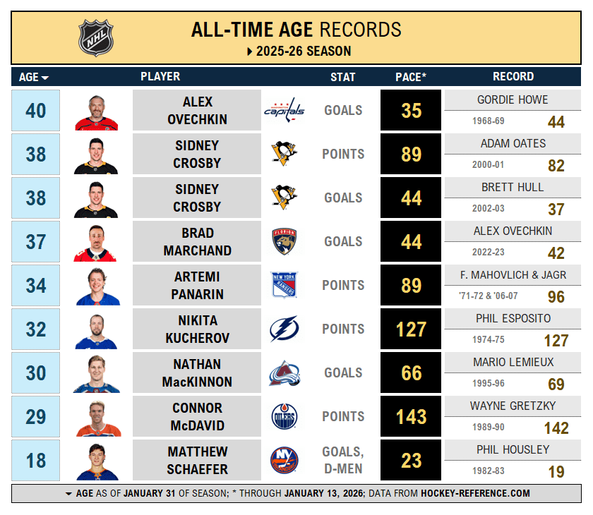 While games missed are inevitable and sizzling first halves can fade fast, many of these records are reachable. The two age-38 records Crosby is pursuing are within his typical output. Schaefer is just six goals short of Phil Housley’s 43-year-old mark. And always question Nikita Kucherov’s and McDavid’s ability to bank points at your own peril. From greenhorns to graybeards, the generational overlap is a thrill right now.