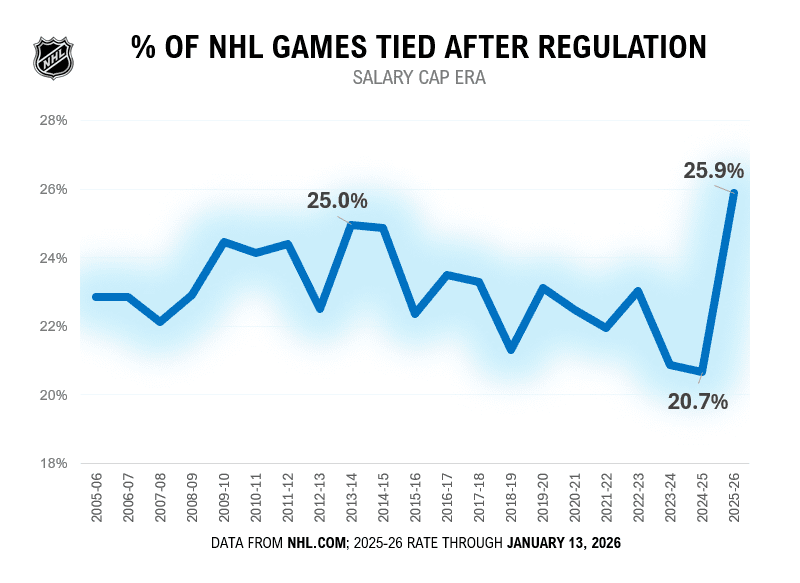 In late November, I wrote about the so-called Season of Parity — the early phenomenon of close games and the inherent ‘loser points’ and tight standings. At the time, a record 28.1% of games were going to overtime. The trend has dialed back to 25.9%, still a cap-era record.