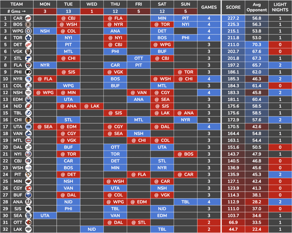 I combined that weekly schedule with a Team Defense Score I created using key defensive metrics to find which teams/skaters have the best schedule this week.