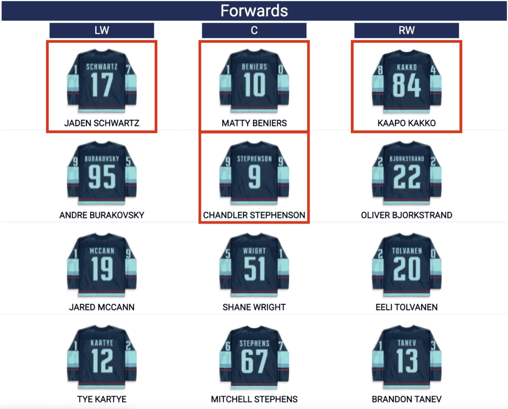 Kakko has been excellent since arriving in Seattle. He has four goals and 10 assists (14 points) in 17 games with Seattle, exactly matching his production from the first 30 games of the season with New York. He’s seen a 3:32 bump in TOI since the trade and has formed a strong relationship with Matty Beniers and Schwartz on the top line. You’d like to see more shot volume out of Kakko, but that line has done a nice job of generating high-danger looks.