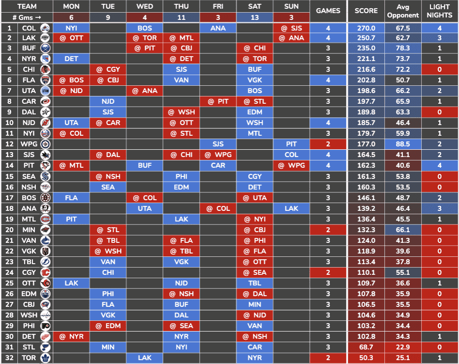 I combined that weekly schedule with a Team Defense Score I created using key defensive metrics to find which teams/skaters have the best schedule this week.