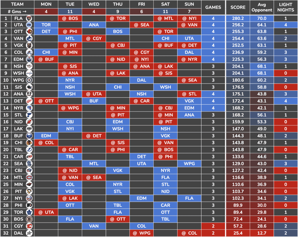 The Panthers have by far the easiest schedule this week, with an average opponent rating of 70.0. However, they only have one light night game. Thankfully, the busy nights this week aren’t that busy, so you might be able to squeeze them into your lineup anyway. Check your lineup on Tuesday, Thursday, Saturday, and Sunday to ensure you have room for some Florida Panthers.