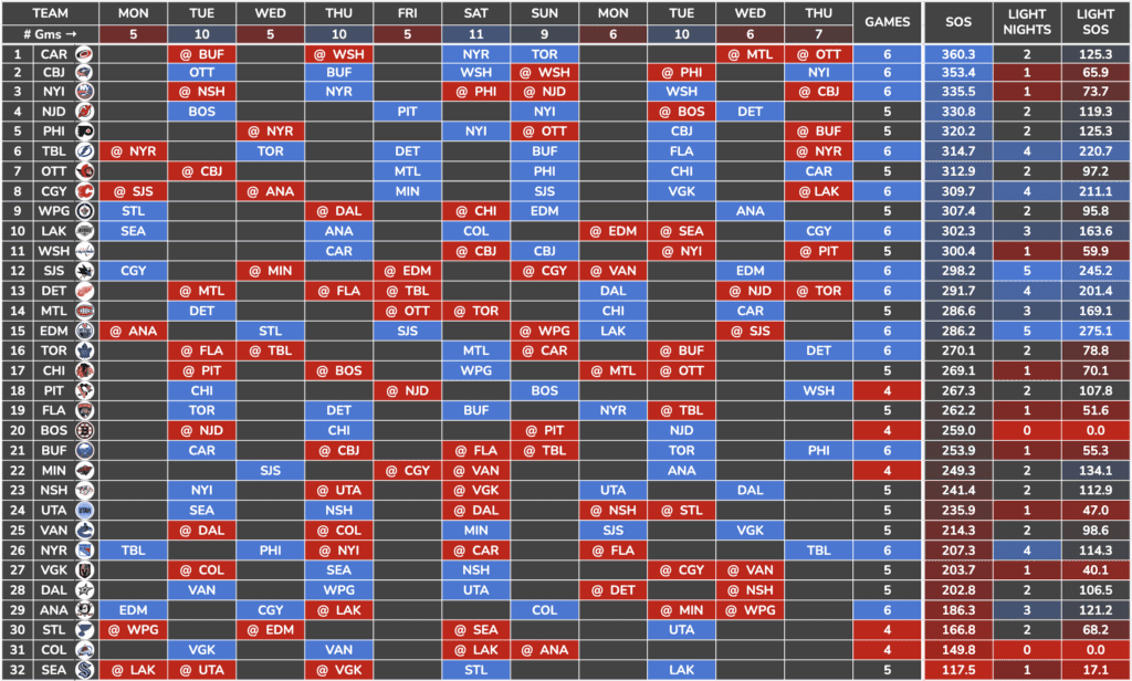 Identifying the players with four games each week and filling your roster with those players can increase your chances of winning your fantasy hockey matchup. That’s why our Weekly Schedule tool is so helpful!