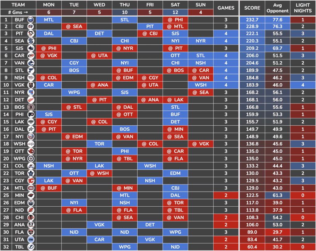 I combined that weekly schedule with a Team Defense Score I created using key defensive metrics to find which teams/skaters have the best schedule this week.