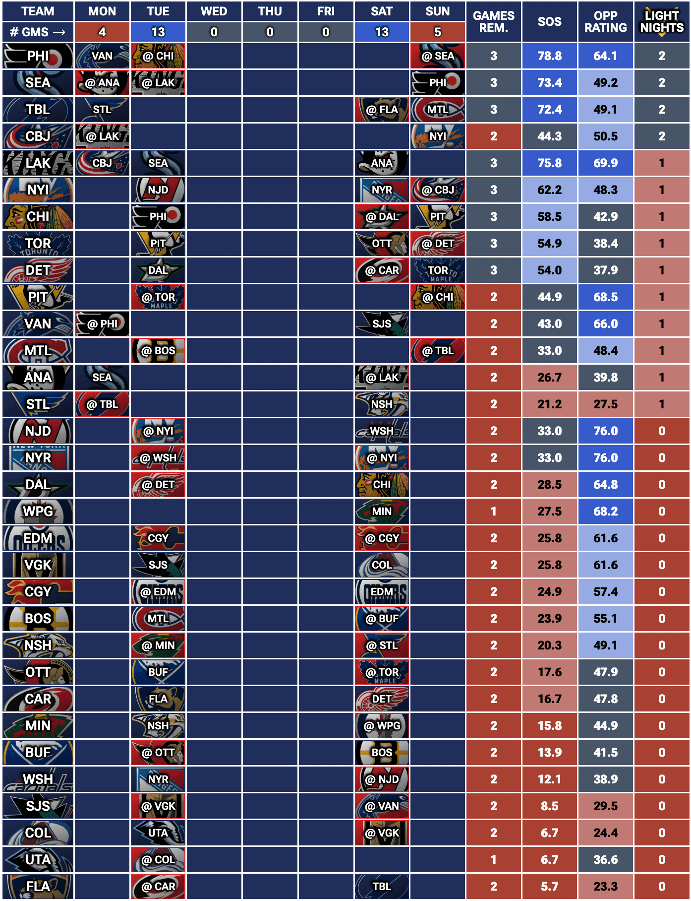 Each week, we evaluate every NHL team’s upcoming slate using three key factors: