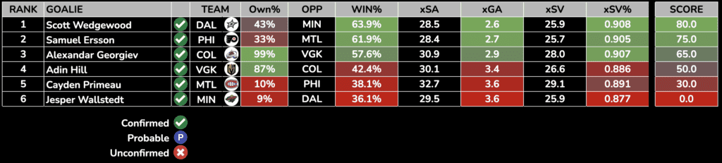 Each day, we will rank the day’s starting goalies based on their Projected Win%, Goals Against Average, and SV%. Win percentage and expected goals against is generated from Sportsbooks Odds and Implied Totals.