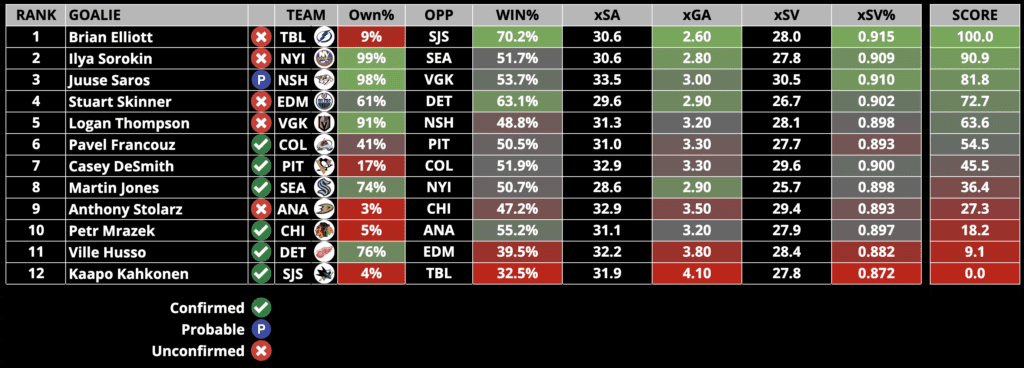 We here at DailyFaceoff try to make being a Fantasy Owner as easy as possible. Each day, we will rank the day’s starting goalies based on their Projected Win%, Goals Against Average, and SV%. Win percentage and expected goals against are generated from Sportsbooks Odds and Implied Totals.