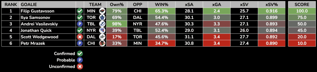 Each day, we will rank the day’s starting goalies based on their Projected Win%, Goals Against Average, and SV%. Win percentage and expected goals against is generated from Sportsbooks Odds and Implied Totals.