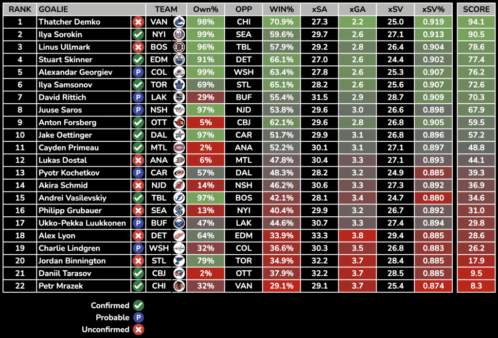 Each day, we will rank the day’s starting goalies based on their Projected Win%, Goals Against Average, and SV%. Win percentage and expected goals against is generated from Sportsbooks Odds and Implied Totals.