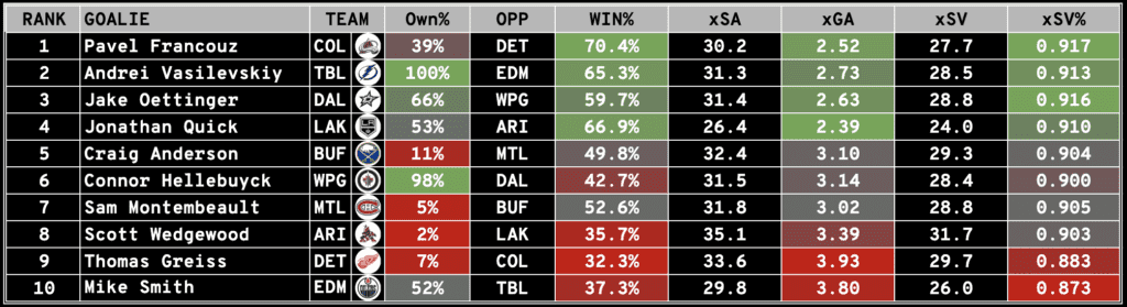 Each day, we will rank the day’s starting goalies based on their Projected Win%, Goals Against Average, and SV%. Win percentage and expected goals against is generated from Sportsbooks Odds and Implied Totals.