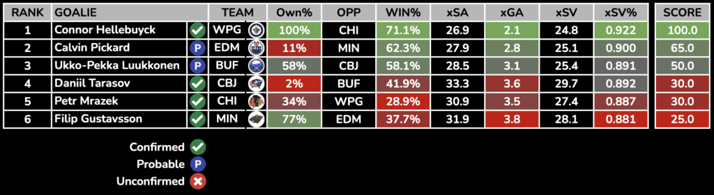 Each day, we will rank the day’s starting goalies based on their Projected Win%, Goals Against Average, and SV%. Win percentage and expected goals against is generated from Sportsbooks Odds and Implied Totals.