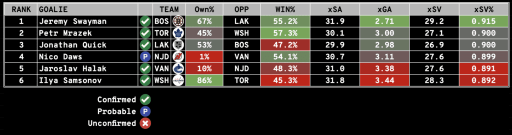 Each day, we will rank the day’s starting goalies based on their Projected Win%, Goals Against Average, and SV%. Win percentage and expected goals against is generated from Sportsbooks Odds and Implied Totals.