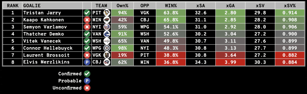 Each day, we will rank the day’s starting goalies based on their Projected Win%, Goals Against Average, and SV%. Win percentage and expected goals against is generated from Sportsbooks Odds and Implied Totals.