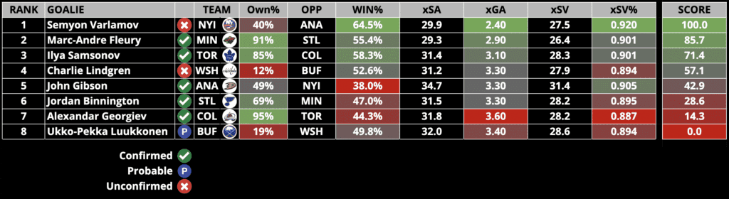 Keep an eye on our Starting Goalies page to ensure the goals listed below are CONFIRMED to start.