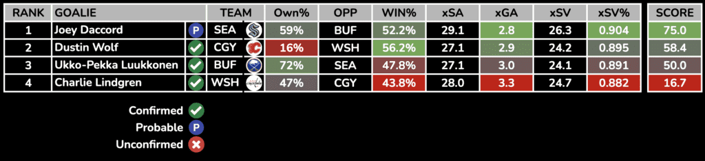 Each day, we will rank the day’s starting goalies based on their Projected Win%, Goals Against Average, and SV%. Win percentage and expected goals against is generated from Sportsbooks Odds and Implied Totals.