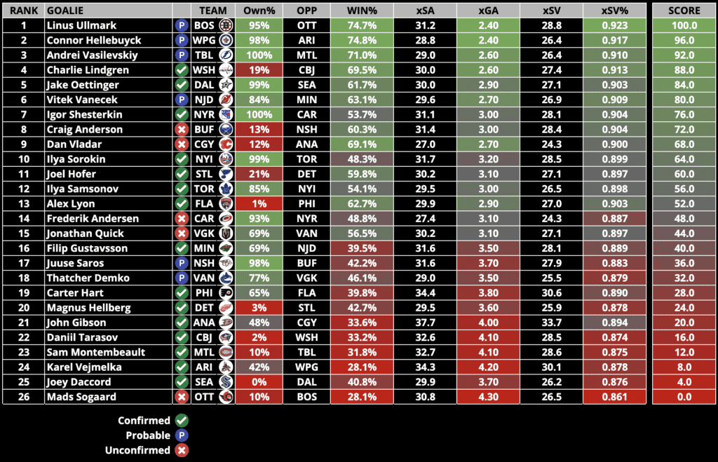 Keep an eye on our Starting Goalies page to ensure the goals listed below are CONFIRMED to start.