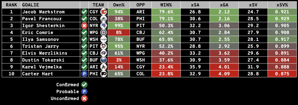 Each day, we will rank the day’s starting goalies based on their Projected Win%, Goals Against Average, and SV%. Win percentage and expected goals against is generated from Sportsbooks Odds and Implied Totals.
