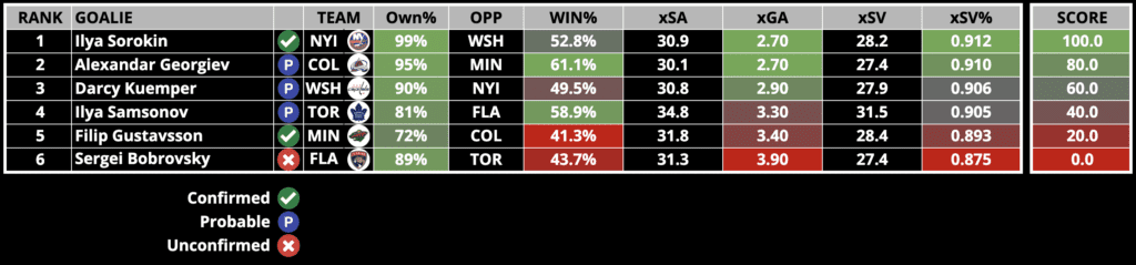We here at DailyFaceoff try to make being a Fantasy Owner as easy as possible. Each day, we will rank the day’s starting goalies based on their Projected Win%, Goals Against Average, and SV%. Win percentage and expected goals against are generated from Sportsbooks Odds and Implied Totals.