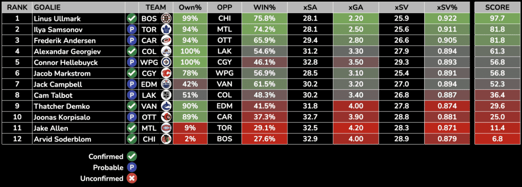 Each day, we will rank the day’s starting goalies based on their Projected Win%, Goals Against Average, and SV%. Win percentage and expected goals against is generated from Sportsbooks Odds and Implied Totals.