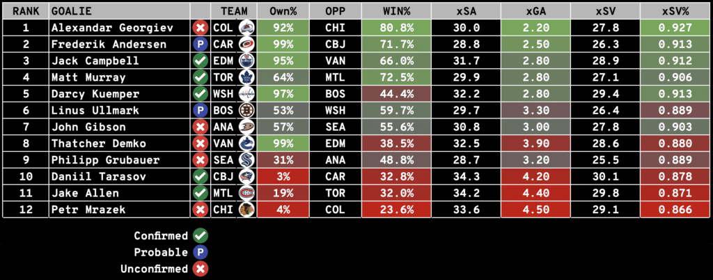 We here at DailyFaceoff try to make being a Fantasy Owner as easy as possible. Each day, we will rank the day’s starting goalies based on their Projected Win%, Goals Against Average, and SV%. Win percentage and expected goals against are generated from Sportsbooks Odds and Implied Totals.