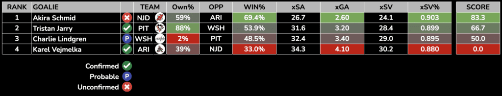 Each day, we will rank the day’s starting goalies based on their Projected Win%, Goals Against Average, and SV%. Win percentage and expected goals against is generated from Sportsbooks Odds and Implied Totals.