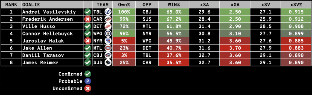 We here at DailyFaceoff try to make being a Fantasy Owner as easy as possible. Each day, we will rank the day’s starting goalies based on their Projected Win%, Goals Against Average, and SV%. Win percentage and expected goals against are generated from Sportsbooks Odds and Implied Totals.