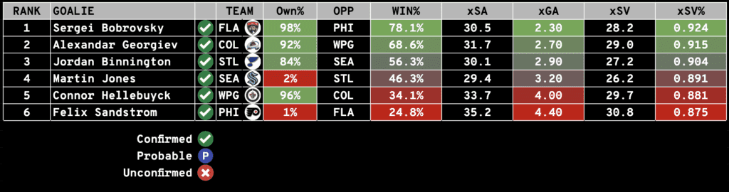 We here at DailyFaceoff try to make being a Fantasy Owner as easy as possible. Each day, we will rank the day’s starting goalies based on their Projected Win%, Goals Against Average, and SV%. Win percentage and expected goals against are generated from Sportsbooks Odds and Implied Totals.