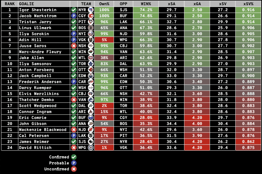 We here at DailyFaceoff try to make being a Fantasy Owner as easy as possible. Each day, we will rank the day’s starting goalies based on their Projected Win%, Goals Against Average, and SV%. Win percentage and expected goals against are generated from Sportsbooks Odds and Implied Totals.