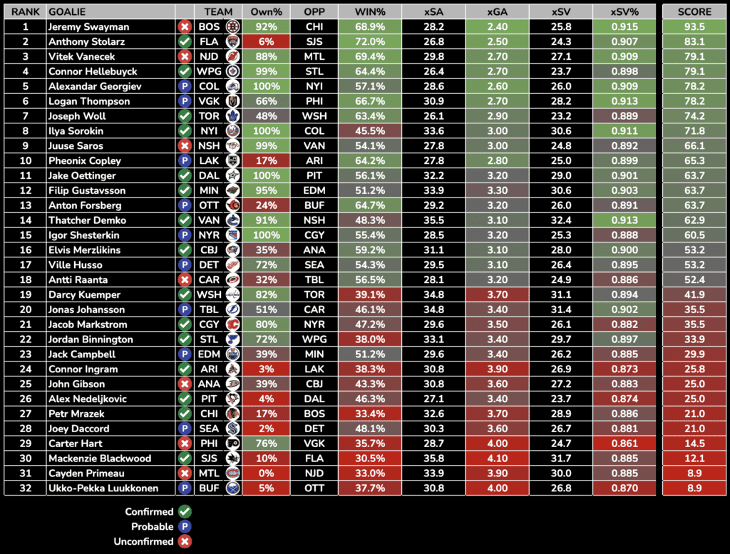 Each day, we will rank the day’s starting goalies based on their Projected Win%, Goals Against Average, and SV%. Win percentage and expected goals against is generated from Sportsbooks Odds and Implied Totals.
