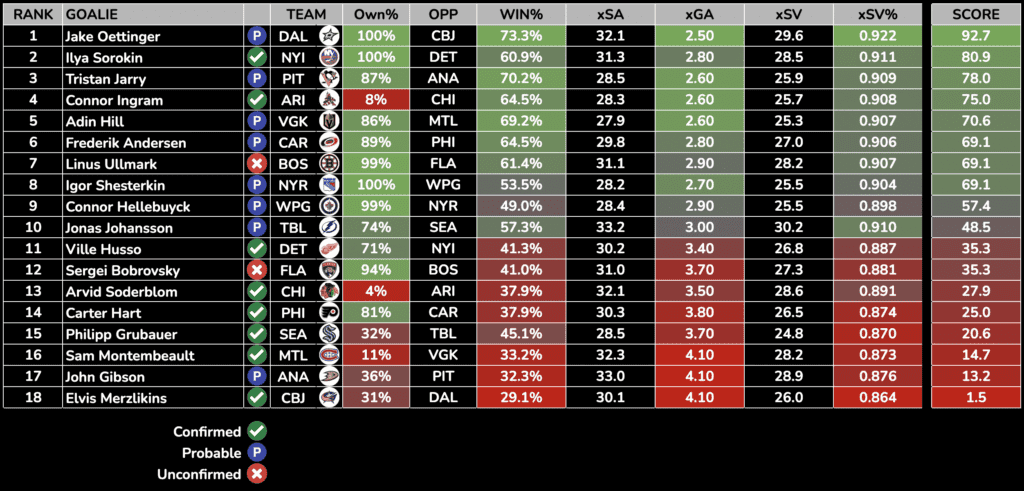 Each day, we will rank the day’s starting goalies based on their Projected Win%, Goals Against Average, and SV%. Win percentage and expected goals against is generated from Sportsbooks Odds and Implied Totals.