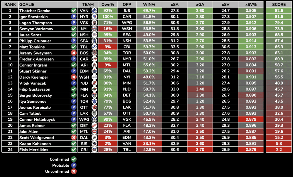 Each day, we will rank the day’s starting goalies based on their Projected Win%, Goals Against Average, and SV%. Win percentage and expected goals against is generated from Sportsbooks Odds and Implied Totals.