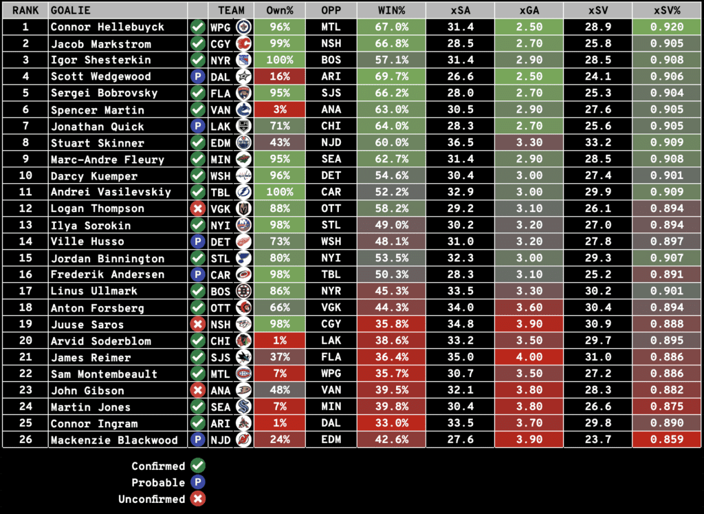 Keep an eye on our Starting Goalies page to ensure the goals listed below are CONFIRMED to start.