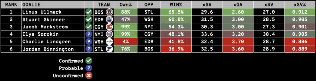 Keep an eye on our Starting Goalies page to ensure the goals listed below are CONFIRMED to start.