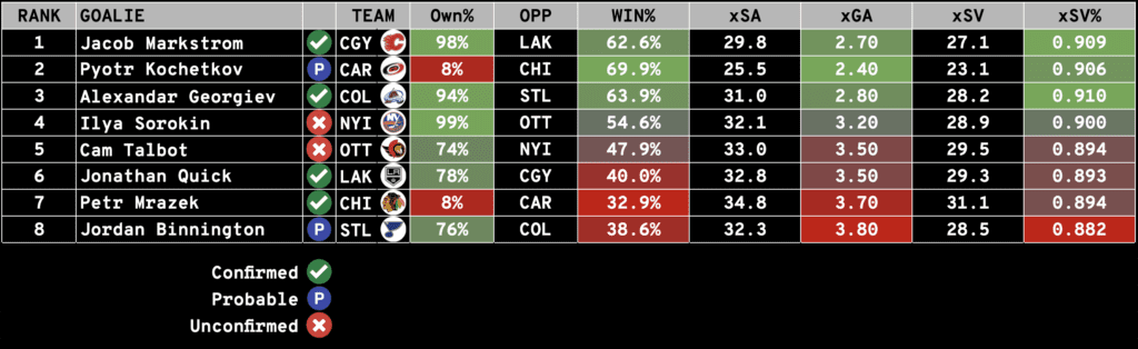 Keep an eye on our Starting Goalies page to ensure the goals listed below are CONFIRMED to start.