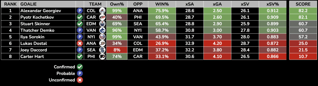 Each day, we will rank the day’s starting goalies based on their Projected Win%, Goals Against Average, and SV%. Win percentage and expected goals against is generated from Sportsbooks Odds and Implied Totals.