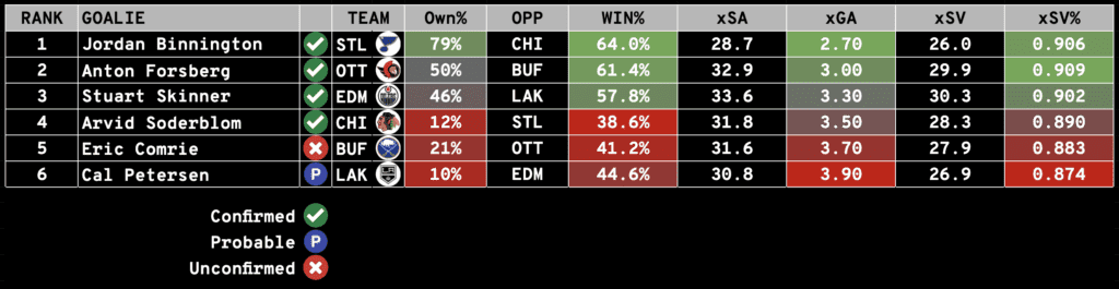 Keep an eye on our Starting Goalies page to ensure the goals listed below are CONFIRMED to start.